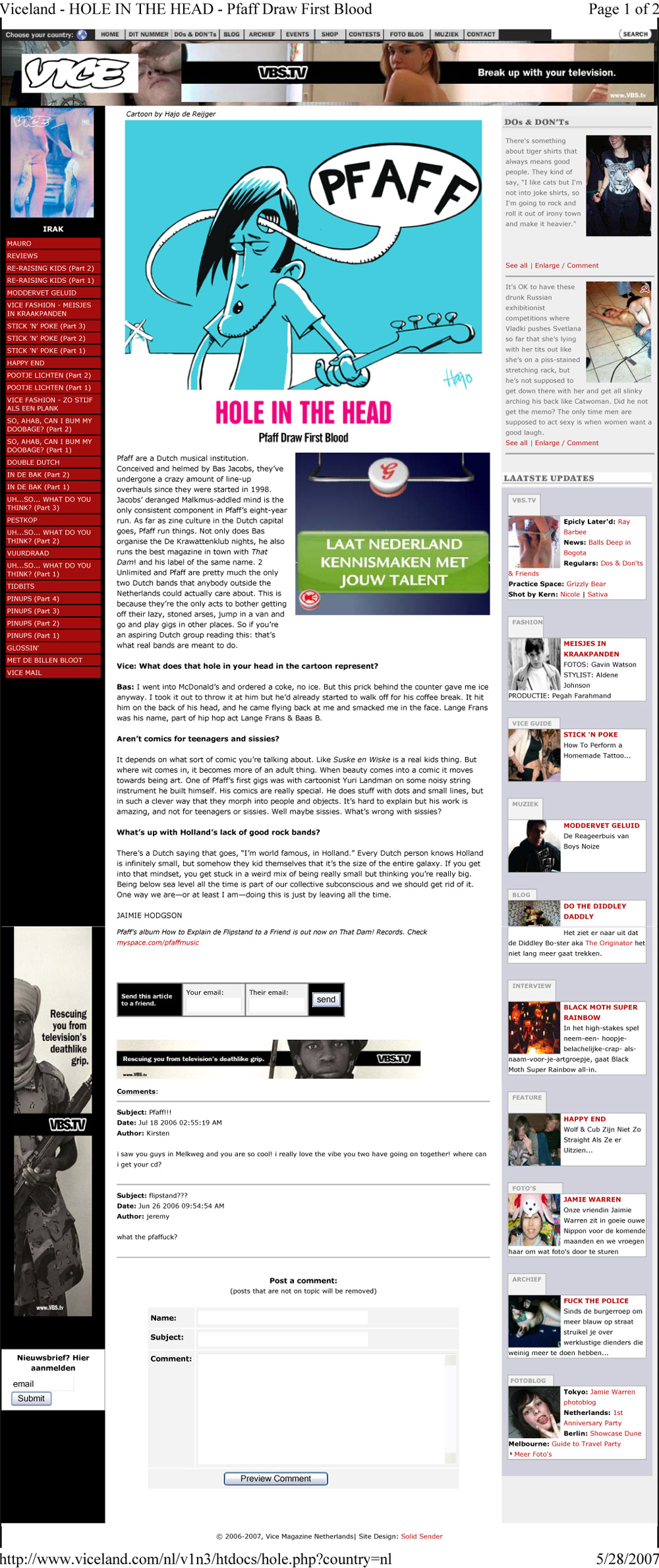 Pfaff! Meteen maar even met de deur in huis vallen, hoewel dit soort cliché uitdrukkingen niet passen bij Bas Jacobs. Bas Jacobs, voorheen bassist van Seedling, is het ongeremde brein achter de band Pfaff en hij is nog één van de weinige muzikanten die me keer op keer prettig weet te verrassen of zelfs overrompelen. Dat komt door de spontaniteit in zijn muziek, de bevrijdende expressie. Het zit ook boordevol humor – bijvoorbeeld door een verborgen track op vinyl, maar ook qua teksten – of misschien nog meer vol speelplezier, die je bloedserieus moet nemen. Maar ook zijn activiteiten samen met Bas Morsch binnen het label en magazine zonder beperkingen That Dam! mogen er wezen. Pfaff, klap op mijn gezicht.kom terzake! Pfaff heeft als opvolger van het boek en cd Bleek en Berliner Blick (met daarop de bonus cd Chi Fa Da Se, Fa Per Tre) het vierde album How To Explain De Flipstand To A Friend uitgebracht. Naast Bas (zang, gitaar, drums) doet ook ex-Riplets lid Alice Bron (gitaar, keyboard, kazoo, percussie, zang) mee en is Narrominded labelbaas en Living Ornaments-lid Lars Meier tevens van de partij, gewapend met zijn keyboard. Ze maken maar liefst 16 zeer puntige nummers, die samen goed zijn voor 27 minuten muzikale ontlading op hoog niveau. En toch is dat gewoon genoeg, geen gezever om nummers langer dan nodig te rekken. Je punt maken en verder gaan. Je hoort op aanstekelijke wijze het beste van de Pixies, Pavement, Iggy Pop en The Fall langskomen, zij het op een vrije en eigenzinnige manier.
