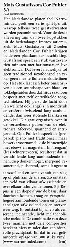 De Zweed Mats Gustafsson bewijst dat al jaren solo en zijn project The Thing maar ook bij artiesten als Peter Brötzmann, Otomo Yoshihide, Zu, The Boredoms, Derek Bailey, Ken Vandermark, Joe McPhee en leden van Sonic Youth. Zijn bijdrage op deze nieuwe split bestaat uit één lang stuk van 17 minuten, waarop hij geluiden heeft gemaakt met hoofdzakelijk de baritonsaxofoon en een handvol elektronica. Dat is als je het bijbehorende persbericht moet geloven. Als je op je oren durft te vertrouwen heb je het idee dat je met een zilte bries door je haren naar klotsende boten in de haven luistert die soms overgaan in een metaalwerkplaats, imitaties van “Muttley The Shivering Dog” en zo nu en dan herkenbare saxofoonklanken. Het is een intrigerend hoorspel dat je nauwgezet blijft volgen; je wilt immers geen seconde missen. In het slotstuk gaat het geheel over in een oorverdovende kakofonie van metalige, snerpende geluiden. En dat terwijl het stuk “Sleeping Instructions” heet. Imponerend virtuoos kunststukje, waarvoor je stevig in je stoel moet zitten. Dan heb je pas de helft gehad, want de andere zijde is voor de Amsterdamse toetsenist, uitvinder en instrumentbouwer Cor Fuhler. Ook hij heeft een behoorlijke staat van dienst met zijn eigen Corchestra, maar ook met Palinckx, MIMEO, Otomo Yoshihide en Han Bennink. Hij heeft twee stukken van bij elkaar 19 minuten gefabriceerd met piano en diverse bewerkingen. Het zijn bezwerende stukken geworden die het midden houden tussen ambient, minimal, jazz en musique concrète. Er is een prachtige spanning tussen de akoestische en elektronische geluiden, die al duellerend toch een hechte eenheid vormen. Het getuigt van grote klasse om met minimale middelen en geluiden zo te weten overtuigen als hier. En daar waar Mats nog wel eens tegen het kakofonische aanschuurt, weet Cor juist met het wonderschone en rustieke te flirten. Beide heren maken in ieder geval een enorme indruk.